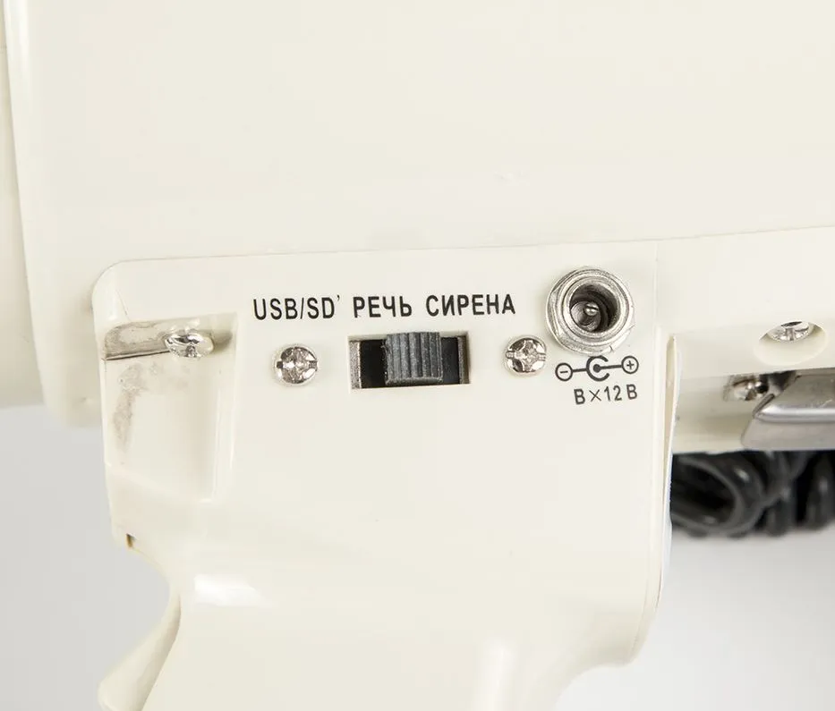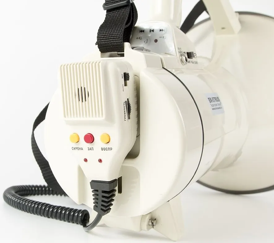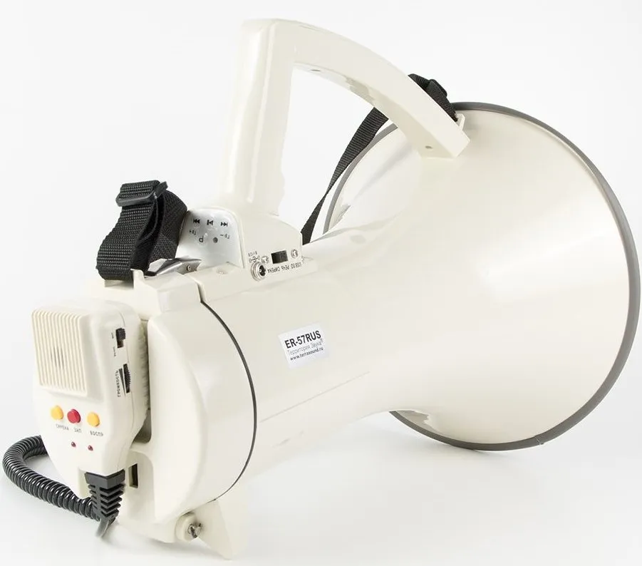 Мощный 40Вт электромегафон TerraSound ER-57RUS с богатым набором функций усиления и воспроизведения звука. Микрофон на витом шнуре удобно использовать при ношении громкоговорителя на плече или при установке рупора на стол или штатив (для этого в корпусе есть специальная резьба), имеется возможность крепления микрофона на корпусе мегафона, что удобно при использовании в ручном режиме или при транспортировке. Помимо микрофона имеется функция записи во встроенную память и циклического воспроизведения речевых сообщений, mp3 проигрыватель с USB или SD носителей, AUX вход для подключения внешних звуковых устройств (телефон или радио микрофон).