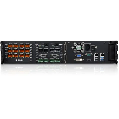 В системе на базе Q-Sys могут использоваться различные периферийные устройства, включая пейджинговые станции, сенсорные контроллеры и специализированные карты входов/выходов.