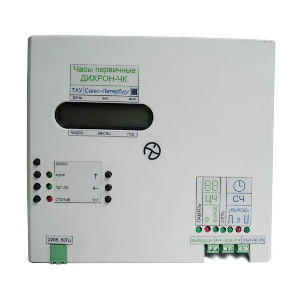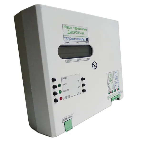 Первичные часы ДИХРОН-ЧК имеют цифровое табло с индикацией информации о шкале времени в объеме: часы, минуты, день недели, число, месяц, год, а также органы управления для установки текущего времени. Счет времени на табло осуществляется от выходных минутных импульсов первичных часов.