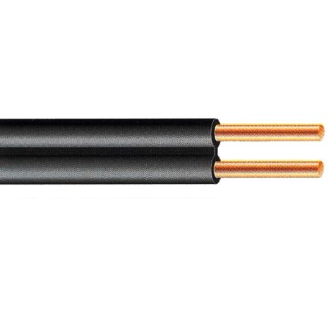 ПЭ и ПВХ изоляция толщиной 0.7 мм накладывается на токопроводящие жилы, расположенные параллельно в одной плоскости, с разделительным основанием размером 0.9 х 2.0 мм. Для наружной прокладки изоляция черного цвета.