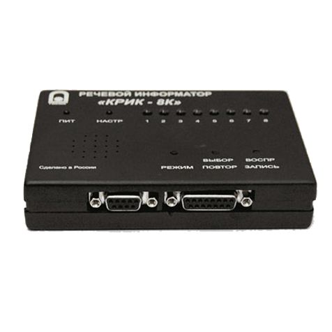 - восьмиканальный речевой информатор «Крик-8К» предназначен для автоматического оповещения работников железной дороги и пассажиров о приближении поезда, а также объявления других сообщений;
